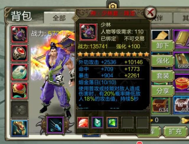 《天龍八部3D》中,人物配備總共10件(左面5件進犯套,右邊5件防護套),每件配備有3個洞洞,總共就有30個洞洞,針對不同的工作鑲嵌相應的寶石,才能讓你這個工作的優勢最大化,針對少林這個工作,小編引薦的寶石套餐是。